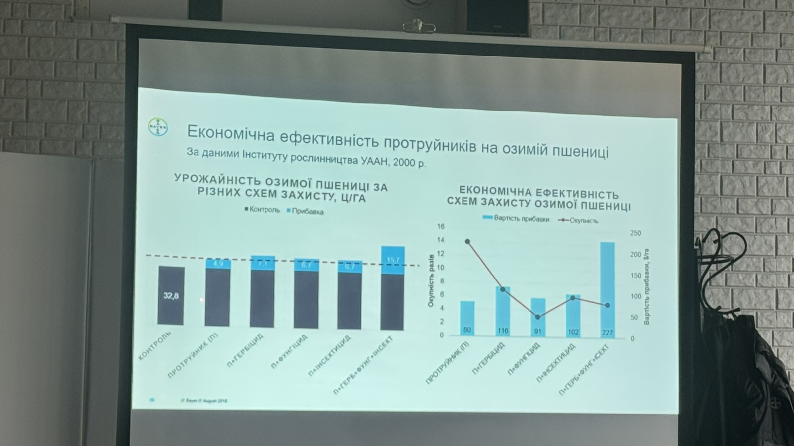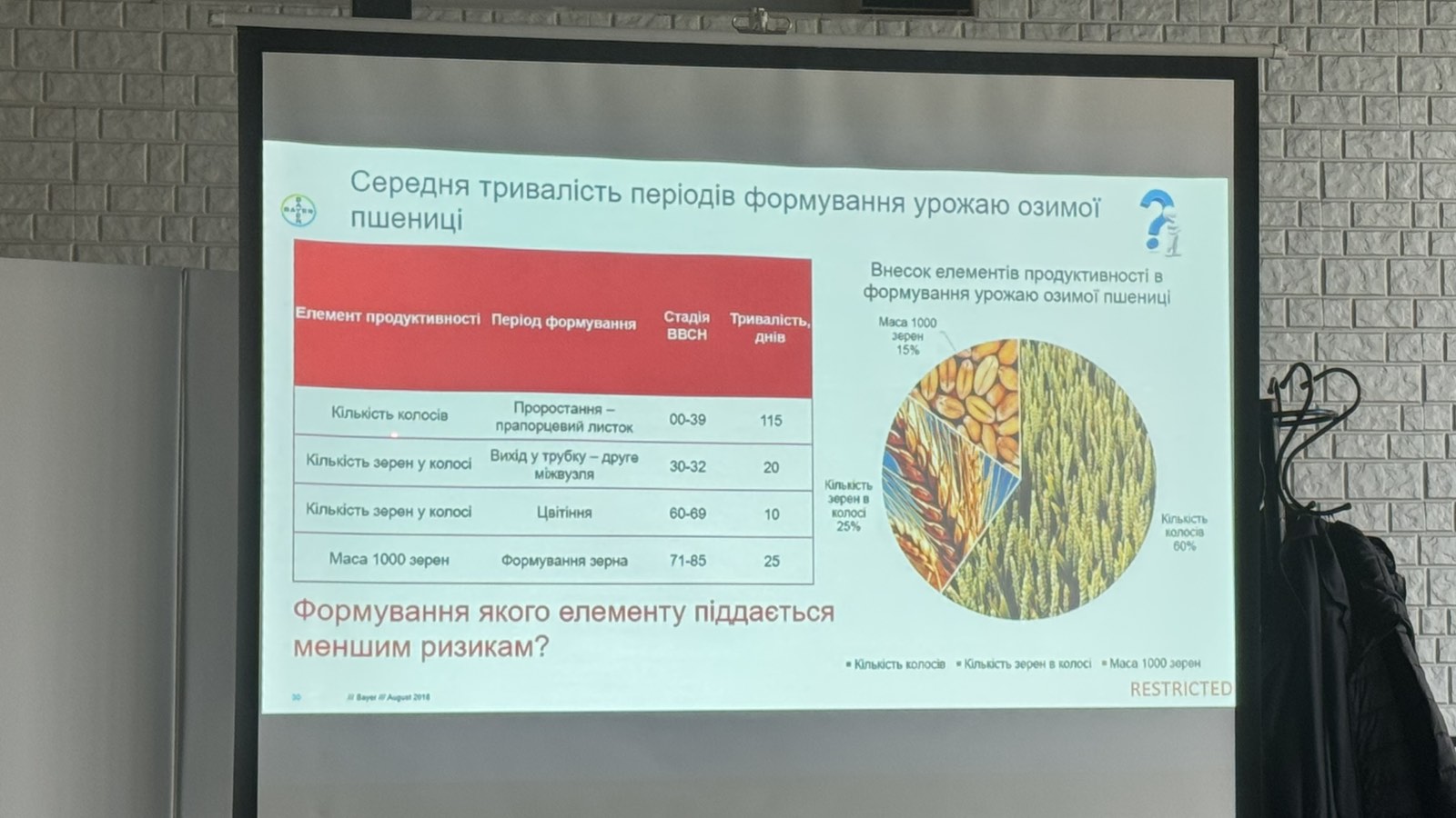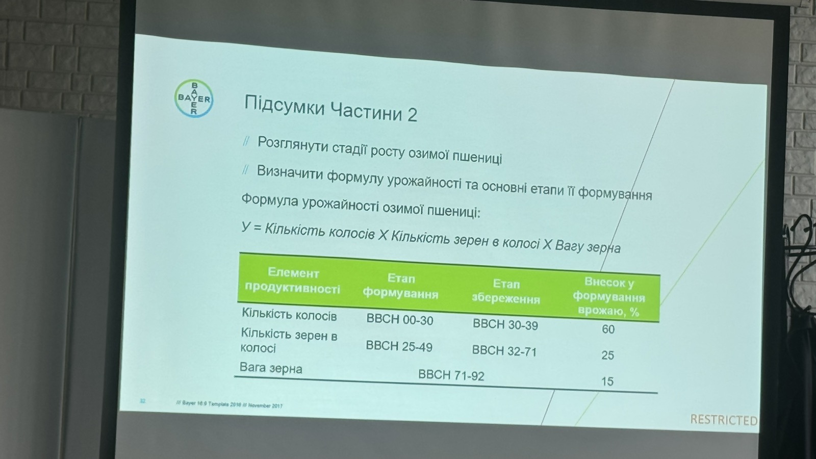 Теоретична частина тренінгу від спеціалістів БАЙЄР висвітлювала основні біологічні особливості пшениці, стадії розвитку та росту, вплив технологічних і погодно-кліматичних факторів на формування продуктивності. Попередники, підготовка грунту, протруєння насіння, строки посіву, норми, захист, удобрення по фазам і планування підживлення, хвороби ,препарати і перспективи отримання високої продуктивності в актуальних умовах - все було презентовано, задавалися питання від учасників семінару і отримувалися змістовні практичні відповіді від спеціалістів.