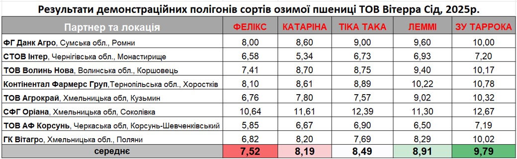 Зовсім скоро ми отримаємо урожайні дані нового сезону 2025р, де в демо також присутні новинки - сорти Леммі, Барба і ЗУ Таррока. А загалом портфоліо компанії на сезон 2025-26 року складається з 9 різнопланових за своїми базовими характеристиками сортів: